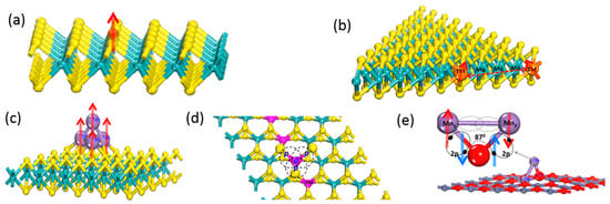 On the other hand, superexchange occurs when the dopants are placed in certain orders, such as aligning the same line within the ILC (as seen in Figure 7d). For instance, in the Cr/Fe δ-doped MoS2 monolayers, the d electrons from the TM dopants strongly couple with the p electrons of the bonded S atom. Due to the difference in unpaired electrons from Cr and Fe, the whole system turns to ferrimagnetism due to the magnetic superexchange []. However, different magnetic interactions may also compete in multiple dopant-doped ILC systems. The interplay between superexchange and direct exchange is shown in Figure 7e. As seen in the Mn-doped-adsorbed m-ZnO, the interplay between the magnetic superexchange and direct exchange enables AFM in the system []. A similar observation was found in the Fe dually doped MoS2 mono- and multilayers. The layer-dependent magnetisms were produced as a result of the competition between the double exchange and superexchange. This arose from the couplings between magnetic impurities located in different sites of the layers, as well as within the impurities [].