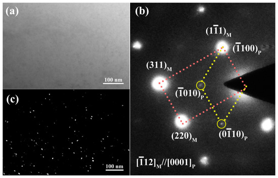 Micrographs and selected area electron diffraction (SAED) pattern of CdZnTe (CZT) crystals grown by the traveling heater method (THM) with slow cooling rate along the zone axis. (a) Bright-field transmission electron microscopy (TEM) micrograph along the zone axis. (b) Dark-field TEM micrograph along the zone axis. (c) SAED pattern along the zone axis.