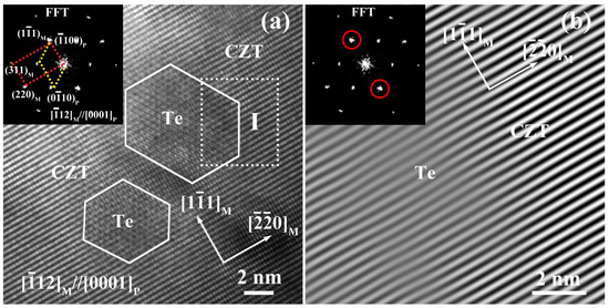 The HRTEM images of CZT sample along the zone axis are shown in Figure 2. The interfaces between Te precipitates and CZT matrix were approximately outlined according to the inverse fast Fourier transform (IFFT) image. Hexagonal Te precipitates smaller than 10 nm in size were observed, shown in Figure 2a. A fast Fourier transform (FFT) pattern of region I in Figure 2a is shown in the inset of Figure 2a,b, respectively. The IFFT image was reconstructed by using the spatial frequencies as marked by red circles in the FFT image, shown in Figure 2b. No lattice mismatch was found at the interface between Te precipitates and CZT matrix. This indicates a perfect coherent relationship, which may be the reason for hardly observing Te precipitates in the bright-field TEM micrograph (Figure 1a).