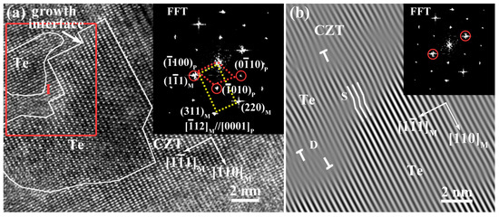 Figure 3a shows an HRTEM image of the specimen near the ingot tail with fast cooling rate (60 °C/h) after growth, where Te precipitates in the irregular and faceted morphology were seen. A ledge growth interface was found on the edge of Te precipitates, which are parallel to the direction and perpendicular to the direction of the CZT matrix. Therefore, the optimal growth direction of Te precipitates is along and in the CZT matrix, attributed to the low interfacial energies on and planes between CZT matrix and Te precipitate phases [17,18]. The faceted morphology of Te precipitates can be caused by a ledge growth mechanism. It is possible that the as-grown interface between Te precipitates and CZT matrix can be retained by the fast cooling rate (60 °C/h) after the growth. The irregular and faceted interface morphology (Figure 3a) indicates that the as-grown interface was obtained. Different from the coherent interface (Figure 2b) under the slowly cooling condition (5 °C/h), the dislocations labeled D and the stacking fault labeled S are seen near the as-grown interface between Te precipitates and CZT matrix along growth direction (Figure 3b). This indicates that it is possible that the dislocations can be main channels for the diffusion and transport of Te atoms in CZT matrix, which play a crucial role in the growth process of Te precipitates in CZT matrix during cooling down.