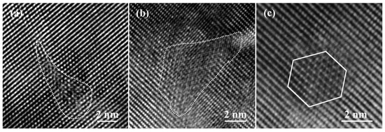 The formation process of Te precipitates is further illustrated in Figure 4. Te precipitates originated from the native point defect condensation [19]. Principal defects are Te interstitials, Cd vacancies, and Te anti-sites in CZT crystals when grown by THM from Te solution. anti-sites with the high migration energy barrier (1.68 eV) are almost immovable, while interstitials with a very low barrier (0.16 eV) are extremely movable along the direction [20], which is consistent with the optimal growth direction of Te precipitates shown in Figure 3a. The migration energy barrier of vacancy is 1.09 eV, between those of antisites and interstitials [20]. Therefore, Te interstitials can be the dominant diffusing species in the nucleation and growth processes of Te precipitates. After the growth, the oversaturated Te interstitial atoms aggregated to form Te precipitation nuclei due to the retrograde solidus of Te atoms in CZT matrix during the cooling of CZT crystals, as shown in Figure 4a. These nuclei caused the lattice distortions, resulting in the formation of dislocations around the nuclei. The dislocations can provide a fast channel for the diffusion and transport of Te interstitial atoms, which promote the growth of the nuclei until the whole excess Te-related point defects (priority to Te interstitials) have precipitated, as shown in Figure 4b. The real shapes of Te precipitates always mean to minimize the elastic strain energy and the total interfacial energy in order to lower the total Gibbs energy. Coherent Te precipitates have been observed in CZT matrix (Figure 2), indicating that the lattice strain energy may be very low. For nano-size Te precipitates, the interfacial energy may contribute more to the shapes of the precipitates for lowering the total system energy [21]. According to theoretical results [17], faces have the lowest interfacial energy in zinc-blende crystal structure. Therefore, the equilibrium morphology of Te precipitates can be bounded by faces and forms a regular polygon. Therefore, the corresponding Te precipitates have also been observed, as shown in Figure 4c.