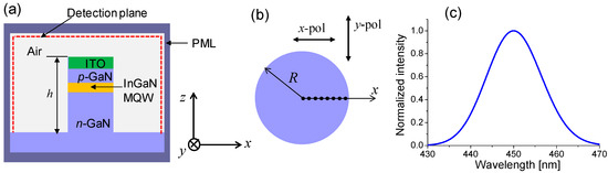 In the FDTD simulation, a single dipole source is positioned at the MQW active region in the z-direction of Figure 1a. The spectral intensity of the dipole source has a Gaussian shape in the frequency axis. As shown in Figure 1c, the peak wavelength and full-width at half maximum of the spectrum are set to be 450 and 15 nm, respectively. The LEE at position (x, y) in the plane of QWs with polarization p () is obtained when considering the spectral average of the source spectrum. That is,