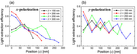 Light extraction efficiency (LEE) is shown as a function of the source position in the x direction for the rod radii of 150, 200, 250, and 300 nm when the dipole source is polarized (a) in the x-direction and (b) in the y-direction.
