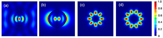Figure 3a,b show electric field intensity distribution of the radial modes (RMs) for rod radius of 200 and 250 nm, respectively. Figure 3c,d show that of the whispering gallery modes (WGMs) for rod radius of 200 and 250 nm, respectively. The RM oscillates in the direction of rod diameter (x-direction in Figure 3a,b), and the light coupled with the RM can escape the nanorod structure relatively easily, resulting in a high LEE. On the contrary, the WGM oscillates along the circumference of the rod. The WGM generally has a very high Q and appears as the lasing mode of a micro-disk laser [26]. If a dipole source couples with the WGM, the emitted light travels along the circumference of the rod and escapes from the rod quite slowly, resulting in a low LEE. This can explain the decreasing behavior of the LEE with an increasing source position in Figure 2.