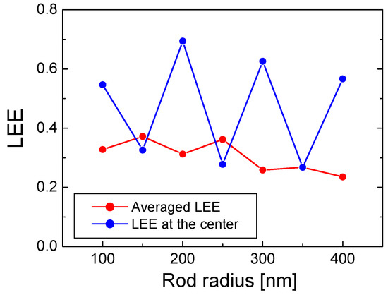 In Figure 4, the averaged LEE defined in Equation (3) is plotted as a function of rod radius along with the LEE at the rod center. The LEE at the rod center changes sensitively with the rod radius. It can be higher than 60% when the rod radius is 200 and 300 nm. However, it decreases below 30% when the radius is 250 and 350 nm. This large variation is attributed to the strong dependence of resonant mode profiles at the rod center on the radius of the nanorod, as discussed before. The averaged LEE changes much stably with the rod radius as a result of the averaging effect. The local peak of the averaged LEE is observed at the rod radius of 150 and 250 nm. In this case, the averaged LEE is slightly higher than the LEE at the rod center. When the rod radius is 150 and 250 nm, the LEE at the center is low and the LEE at large x is relatively less decreased. Since the contribution to the averaged LEE increases linearly with x, as one can see from Equation (3), relatively high averaged LEE was obtained for the rod radius of 150 and 250 nm where the LEE at large x is relatively high.