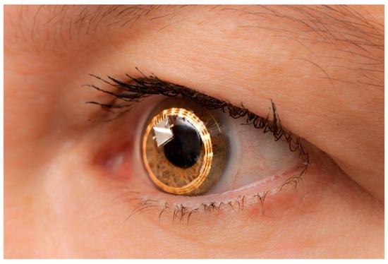 There is already an emerging market in smart contact lenses that are designed primarily as wearable medical sensors to assist in treating/detecting problems with the eye or by analyzing the tears. Triggerfish® (Lausanne, Vaud, Switzerland) from Swiss company Sensimed AG, shown in Figure 1, uses a smart contact lens to determine a patient’s susceptibility to glaucoma []. Google [] and Microsoft [] have been developing contact lenses to measure the glucose level in tears as a way to help those that suffer with diabetes manage their condition better. Each of these devices has an in-built antenna that enables communication with an external device so the user or medical practitioner can record or be alerted to any significant changes.