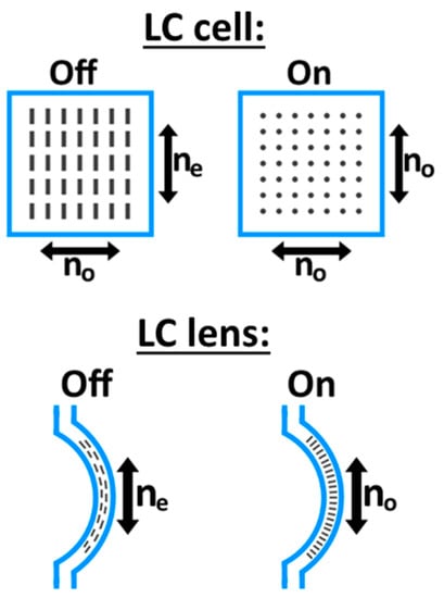 Liquid crystals (LCs) are used in electro-optic devices (such as switchable lenses) due to their anisotropic refractive indices and the ability to reorient in response to a voltage [,]. Figure 2 illustrates a typical LC cell and a cross section of how a LC lens might function. For the configurations shown, both the ordinary no and the extraordinary ne refractive index components are observed when the liquid crystal is parallel to the surface of the substrate, depending on the polarization of the incident light. Only no is observed when the liquid crystal aligned perpendicular to the surface. For light polarized parallel the direction of ne shown in Figure 2, the refractive index experienced can be varied between ne and no (or vice-versa) and is controlled by using an appropriate alignment layer, liquid crystal and electric field [,]. Intermediate refractive indices, , are achieved for LC orientations with respect to the polarization of the light that lie between the extremes of parallel and perpendicular to the surface [,].