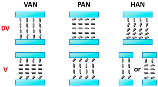 Typical alignment modes that can be used in LC contact lenses. Vertically aligned nematic (VAN), Planar aligned nematic (PAN) and hybrid aligned nematic (HAN) are pre-determined by the alignment layer and must be matched with an LC with the appropriate dielectric anisotropy.