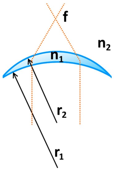 Here, n1 is the refractive index of the lens, n2 is the refractive index of medium around the lens, r1 is the radius of inner curvature of lens and r2 is the radius of outer curvature of lens. A lens with a positive meniscus and focal power is illustrated in Figure 5.