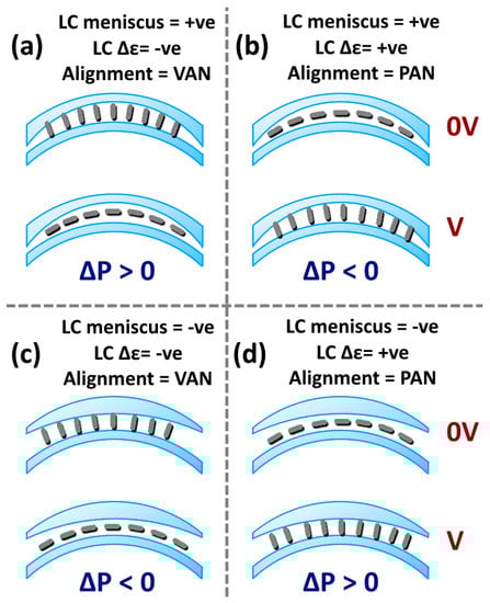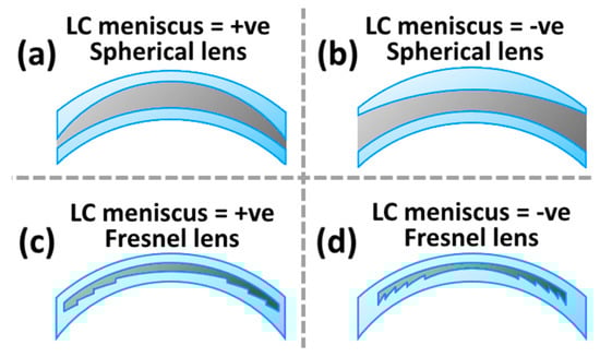 The dielectric anisotropy of the LC used and the shape of its lens cavity will predetermine how the device functions in the switched OFF state, V = 0; and ON, V >> VC, where VC is the Fréedericksz threshold dictated by the LC elastic constants and dielectric anisotropy and, importantly, is independent of cell gap. Figure 6 illustrates how the shape and dielectric anisotropy of the LC layer must be considered when designing the device []. Figure 6a,b shows an LC layer with a positive meniscus, whereas (c) and (d) illustrate negative meniscus systems. The dielectric anisotropy, ∆ε of the liquid crystal in (a) and (c) is negative, whereas it is positive in (b) and (d). LC layers with positive or negative ∆ε are aligned as Vertically Aligned Nematic (VAN) or Planar Aligned Nematics (PAN) respectively for the appropriate device. Using a negative ∆ε LC material within a positive meniscus will result in a positive change in focal power. This is due to the observed refractive index switching from no to ne as the LC reorients from perpendicular to parallel to the substrates. The LC lens layer has a positive focal power, which increases by switching the lens as ne > no. Alternatively, there is a reduction in focal power when using a positive ∆ε material in a positive meniscus geometry as the observed refractive index changes form ne to no. Likewise, there is a reduction in focal power when using a negative ∆ε material that is in a negative meniscus shape. This is due to the magnitude of its negative power of magnification increasing when switching from no to ne. Best operation requires high ∆n LC to be used, wherein a +2D requires a typical minimum cavity spacing of about 30 μm. The solid lens designs depicted in Figure 6 are the simplest to manufacture, but it require higher quantities liquid crystal and will have a longer switching time than other, lower spacing lens designs based on diffractive optic structures (detailed later).