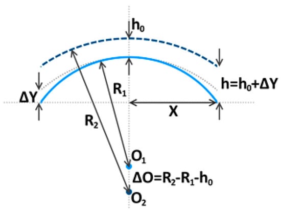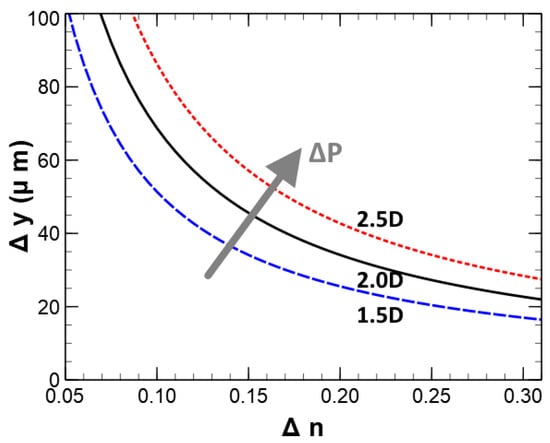 Substituting into Equation (4) generates Figure 8, in which an aperture radius x = 2.5 mm [] and an inner radius r1 = 7.8 mm [] were used as they are consistent with the cornea human eye. Equation (4) can be used to calculate the minimum gap within the LC layer ΔY, assuming that the refractive index is switching between ne and no. The plot in Figure 8 [,] shows the required ΔY (with an aperture radius x = 2.5 mm and an inner radius r1 = 7.8 mm) with respect to Δn’ to enable ±1.5D, ±2.0D and ±2.5D changes in focal power. This demonstrates that the lens cavity spacing can be made lower if a LC with a larger Δn is used, which is the intuitive result.