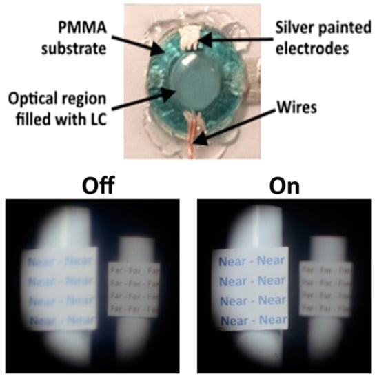 Example of a contact lens formed in PMMA that uses a convex solid geometry based on homeotropic homogeneous alignment []. Shown below are the 0 V and 7 Vrms images taken through the contact lens for objects at 5 cm and 15 cm distances. In this example, a positive meniscus lens with the geometry of Figure 6a has been used, so that applying the field causes a +2D optical change as required for the presybope. The focal distances used here do not represent what the eye would see, since much of the focusing is still done by the presbyopic lens.