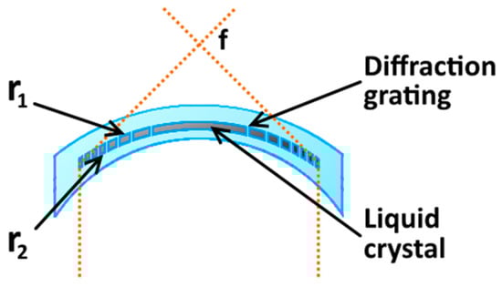Fresnel shaped lenses use refraction to focus light passing through the lens with reduced thickness of lens, and hence less chromatic aberrations, (since the thinner lenses leads to less wavelength dispersion of the refractive index). This approach uses components of a comparable curved lens segmented into sections, illustrated in Figure 11, to make the lens thinner and therefore likely to be more comfortable to wear [,]. A spherical lens design can typically have a minimum cell gap of 30 μm. The cell spacing of a comparable Fresnel system is calculated approximately by replacing the aperture width x in Equation (4) with the radial distance of the Fresnel zones [].