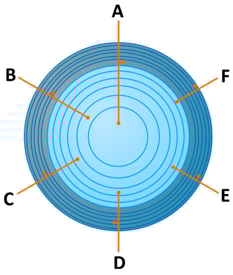 Diffractive lenses have also been applied to contact lenses. With electrode-patterned lenses, the diffractive lens designs avoid having to shape the substrates for the contact lenses entirely. Instead, the electrodes used to apply an E field over the lenses are patterned using photolithography [,,,]. The design principles for these electrodes are illustrated in Figure 12, where two grouped-domains are shown (light and dark blue regions), each containing six diffractive sub-domains. These sub-domains are used to apply a staggered E-field over the grouped-domain they occupy (making the lens profile closer to the Fresnel shaped LC than the zone plate system). Figure 12 illustrates six vias that are orientated radially and used to apply potential to the six separate sub-domains. This potential is also applied to the same relative sub-domains within each grouped domain. For example, the last sub-domain in each grouped-domain can have the same potential applied. This is due to the sizes of both the grouped-domains and the sub-domains being carefully staggered to enable the device to successfully lens. This results in the applied E field varying over the lens (for example the E field for electrodes connects to wires A > B > C > D > E > F, as shown in Figure 12) to get the correct optical properties for the device. Figure 13 illustrates this principle further by showing how the required E-field and radii of each sub-domain corresponds to the multi-level diffractive components of the device. These components contribute towards the kinoform profile of the lens, where both the diffractive and phased properties of the domains are aligned for the best optical properties []. This, in-turn, results in the variable refractive properties of the whole lens. The optical power of the entire device is controlled by changing the E field applied to each electrode domain throughout the lens. Ideally, a large number of electrodes would be required to give a smoothly varying index profile and reduce chromatic aberrations. However, this may be negated using resistive vias to control the voltage applied to the electrodes, but greatly reducing the number of voltage levels required []. This type of lens is arguably the most complicated design out of all the lenses discussed here, and may be the most difficult to manufacture and control in a contact lens.