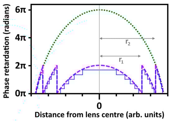 Plot demonstrating the relationship between the phase retardation of light passing through the lens with respect to its distance from the center. The green dotted line indicates the refractive profile, the purple dashed line is the kinoform profile, and the solid blue line is a multi-level diffractive profile [].