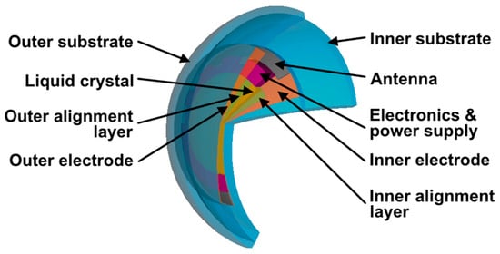 Illustration of the basic design principles for an LC contact lens. The LC is encapsulated between two substrate lenses. Both of the substrates are coated with electrode and alignment layers on their inner surfaces. The electronics (processor, power supply and antenna) are kept out of the central region of the lens so they do not block the wearer’s vision.