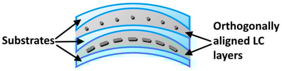 where fTotal is the total focal power of the whole device, f1 is the focal power of the bottom substrate, fLC is the focal power of the LC lens layer and f2 is the focal power of the top substrate. The total focal power of the device is made negligible if the focal powers of the combined substrates are equal and opposite to the focal power of the LC layer, with a so-called balanced optical system [] Such an approach would be useful for those who only require visual correction for presbyopia and not distance vision. At least one of the substrates must have positive focal power if the LC layer has a negative focal power, or vice-versa (illustrated in Figure 4). Equation (3) allows the calculation of the approximate focal power when designing this type of device []: