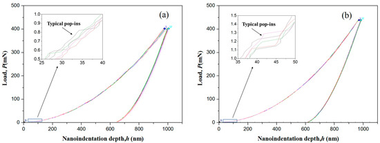 Typical load-displacement curves of sapphire crystal indented on the (a) A-plane and (b) C-plane under ultra-low nanoindentation loads at room temperature. Inset is the magnified region indicated by a rectangle, which presents the pop-in during loading.