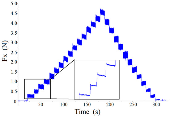 The loading force versus time for an 8-μm indentation depth and a 10 s dwell period. The inset presents an expanded view of the selected region after low pass filtering.