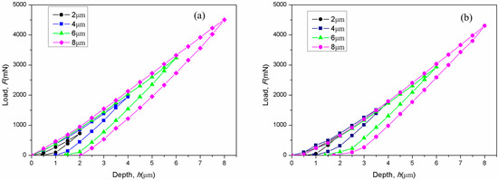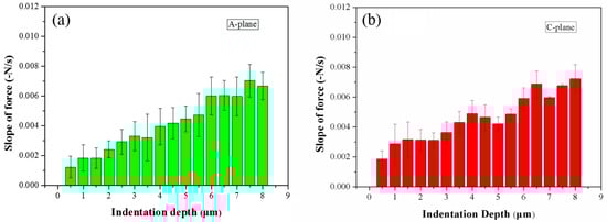 Figure 5 shows the rate at which the applied force declines during each dwell period of the loading stage corresponding to a series of indentation depths for (a) A-plane and (b) C-plane sapphire specimens. In this study, sequential loading-unloading indentation testing was conducted twice for each maximum indentation depth of 0 μm to 2 μm, 0 μm to 4 μm, 0 μm to 6 μm, and 0 μm to 8 μm. Therefore, eight data points were obtained for loading from 0 μm to 2 μm, six data points from 2 μm to 4 μm, four data points from 4 μm to 6 μm, and two data points from 6 μm to 8 μm, and the averages and standard deviations of the slope of the force measured at each dwell period were obtained. From Figure 5a, we see that the slope of the force decreases (i.e., the rate of decline increases) in a nearly monotonic fashion with increasing indentation depth for A-plane sapphire. However, this trend is not nearly as uniform for C-plane sapphire.