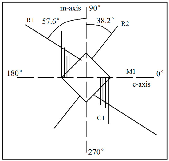 For the A-plane sapphire, Figure 7a shows that cracks occur at an indentation depth of 2 μm. Figure 7d shows that the sapphire spalls at an indentation depth of 8 μm. Sequential indentation on A-plane sapphire reveals four distinct surface features, as illustrated in Figure 9. At a 2-μm depth indentation, some linear traces that are oriented perpendicular to the c-axis are observed, and the number of features gradually increases with increasing indentation depth. Some of the linear traces result in the fractures visible in Figure 7e at an 8-μm depth indentation. The traces observed are all straight, although wavy traces were observed for the static indentation results presented by Haney [16,18]. The orientations of these traces are consistent with earlier findings from Chan and Lawn, Nowak and Sakai, as well as Kim and Kim who all identified these features as basal twins [16]. A second set of cracks are oriented at 51.8° to the c-axis. This is consistent with the intersection of the R-plane and the A-plane, which is also consistent with the findings of Haney [16] and Kim [24]. A third set of cracks are oriented at 147.6° to the c-axis or 57.6° relative to the m-axis. These cracks coincide with the R-plane, which is perpendicular to the A-plane of the sample. A crack is also observed along the c-axis, but it is asymmetrical. As we know, the cracks occur at the position where the stress first reaches to the strength limit. The propagation of cracks follows the equilibrium theory. For the left side of the indentation, a crack propagated along the R-plane. But, the length of crack on the right side is not equal to the left. At the right corner of the indentation, the crack occurs due to the concentrate on the stress and reaching to the strength limit. In brittle materials, radial cracks typically initiate near the edges of the Vickers indenter tips where the highest stress concentrations occur. However, the first three sets of cracks on A-plane sapphire are not located exactly on the corners of the residual indentation impression due to the local crystallography of the sample. This would indicate that the energy that is required to propagate cracks along these preferential directions is less than that required to produce radial cracks, even with stress concentrations at the indenter corners [16]. The fourth set of cracks is generated from the right-hand corner of the indentation. The material piles up, and small plastic deformations are formed around the residual indentation impression on the A-plane. The cracks around the indentation exhibit no regularity. For convenience, we define the first set of crack directions as M1, the second set of crack directions as R2, the third set of crack directions as R1, and the fourth set of crack directions as C1 for A-plane sapphire.