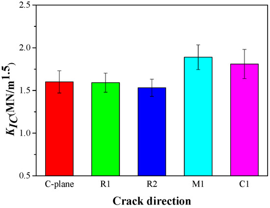 According to the study results from Mao et al. [2], hardness of C-plane sapphire obviously exhibits the indentation size effect (ISE), and the hardness is larger at the ISE region than that at the non-ISE region. The ISE region is to 60 nm. In this study, the hardness we measured is out of the region. The results of hardness and modulus of elasticity see in Section 3.1. The lengths of the cracks extending from the corners of the residual indentation impression for C-plane sapphire exhibit no obvious differences. We hold that the values of KIC along the four directions are equivalent, and the value is determined to be 1.63 MN/m1.5 from Equation (1). The values of KIC for the various crack directions of A-plane and C-plane sapphire are given in Figure 10. These values are smaller than those that are obtained from Graça [4], Newcomb [26], and Wunderlich [27]. Because the dwell period employed was 10 s, the crack has sufficient time to propagate, and relieve the stress. For A-plane sapphire, the value of KIC for M1 is the largest, corresponding to the smallest crack length.