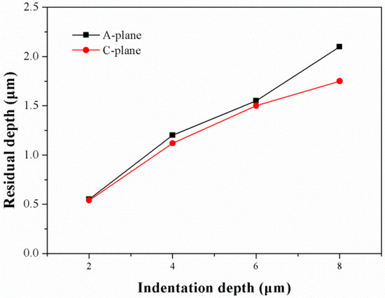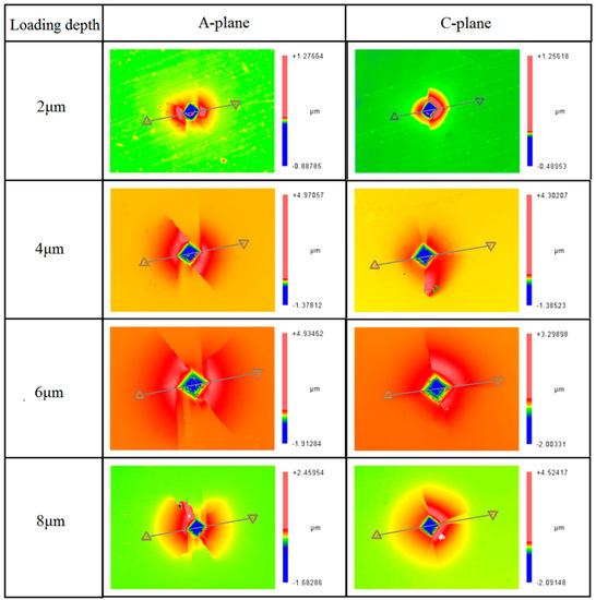 The 3D optical profiler parameters that are employed for measuring the 3D morphology are listed in Table 2. Figure 11 presents the 3D morphology obtained for A-plane and C-plane sapphire tested by sequential indentation after unloading. The 2 μm indicates that the maximun loading depth is 2 μm, respectively. The residual depth was obtained by measuring the cross-sectional profiles, and the cross-sectional profiles are shown at the position of the lines shown in Figure 11. Since sapphire is a kind of brittle material, the residual depth of indentation is smaller than the loading depth. The experiment is conducted at the micron scale, and our purpose is to test the fracture characteristics of materials at the micron scale. The last data of unloading process in Figure 6 is affected by the instrument accuracy. So, the residual depth using the 3D profiler is measured once again. The accuracy of 3D profile is 0.1 nm. These measurements are not affected by the pile-up. The residual depth is the distance from the lowest position of the indentation to material surface and the height of pile-up is not considered. Because the pile-up may be affected by the lateral cracks under the surface. The results are given in Figure 12.
