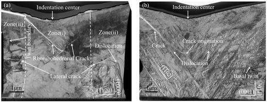 The thickness of the two TEM specimen is about 38.54 nm. Figure 12 shows a TEM cross-sectional image containing two indentations, (a) in the A-plane (110) imaged down (100) and (b) in the C-plane (0001) imaged down (110). The TEM image reveals the existence of a plastic deformation zone. The plastic deformation zone forms under the indenter due to hydrostatic pressure. The dominating deformation modes were observed to be basal twinning on (0001) perpendicular to the indentation surface and dislocations gliding on the non-basal slip planes (Figure 13a). Two zones may be identified at the cross-sectional image, namely (i) the center of image consisting of obvious cracks, and (ii) the two sides of the center cracks consisting of basal twinning, a very high density of dislocations, and small lateral cracks. This angle of the center cracks corresponds to the crystallographic intersection of the R-plane [102] with the M-plane (100). In the center of the indentation, cracks form along the slip systems. But, it does not provide a rationale for the appearance of this twinning trace over other possible rhombohedral twinning systems [16].