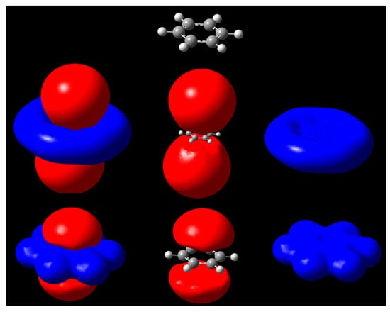 Isopotential surfaces of benzene, separated between negative (red) and positive (blue) regions corresponding to the same absolute value of potential. Isopotential pairs are ±0.03 (second row) and ±0.3 V (bottom). A molecule is depicted for position reference.