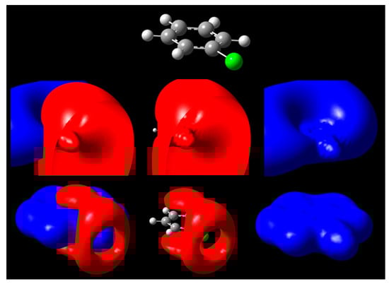A second case is given by chlorobenzene C6H5Cl, shown in Figure 3. For the halogen substituent chlorine, a negative surface covers the positive at low voltages close to 0, but at ±0.3 V, the presence of a σ-hole exposes the positive region underneath. We can attribute this effect to anisotropic distribution of charge leading to accumulation along the equatorial regions of chlorine when it participates in a covalent bond. Therefore, the outermost portion of the halogen atom along the C-Cl bond axis is left vulnerable to possible nonbonding interactions if a negative charge approaches that site (Figure 3). At potentials close to 0, such as 30 mV, the hole is not yet present, while on existing isodensity surfaces of PhCl and halogenated benzenes, it would appear exposed []. Notable differences for the larger halogens include larger σ-hole circumference at identical isopotential values []; the size of the exposed region for phenyl halogens follows the trend PhI > PhBr > PhCl at the ±0.3 V isopotentials. This approach confirms existing literature about increasing halogen capabilities of participating in these types of nonbonding interactions due to differences in size [,].