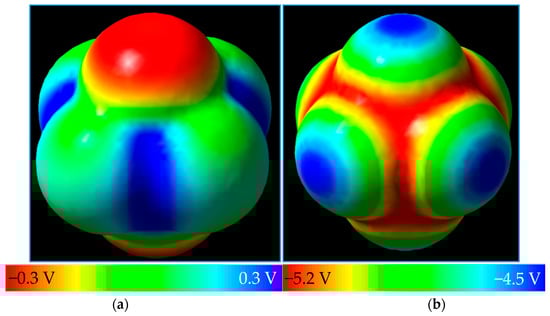 The term is known in DFT as the external potential, , which uniquely determines the density , or vice versa, in Coulomb’s Law, . Here, represents charge on nucleus at position . Each term contributes independently for the nuclei and electrons, respectively []. Thus, as concluded earlier [], the electrostatic potential function is a transformation of the electron density and therefore of the wavefunction, containing all information available in both, and with the additional feature of presenting such information in a more suitable way to study interactions between molecules (intermolecular), as well as interactions in molecules (intramolecular). Poisson’s equation, beyond previously-explored classical methods, relates electrostatic potential with surrounding electron density through the equation , where represents the three-dimensional Dirac delta function. Important interactions include the phenomena at the boundary between positive and negative regions of a molecule, cluster, or crystal, which are of utmost interest for all kinds of physical and chemical interactions with other systems. Interactions that are almost otherwise impossible to track with electron density and wavefunction properties can be revealed with these DFT models []. Molecular electrostatic potentials (MEPs), in recent applications, have become powerful means of analyzing sensitive binding mechanisms, such as the pairing of DNA bases [,] and the handling of volatile materials that require precise detection of minute traces []. MEP’s ability to serve as a logic gate has also found use in information processing as a basis for data operations [,,,,].