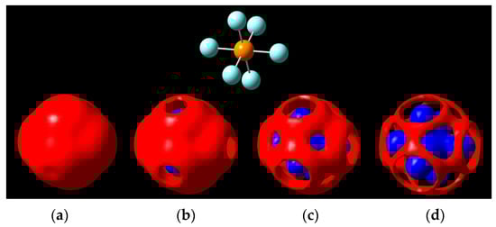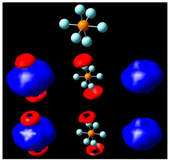 Next, we look to take this method to PF6−, the anion of lithium hexafluorophosphate, LiPF6, one of the most common salts for Li-ion batteries. Its neutral form has not been reported, but may exist for a very short period of time if removal of an electron from the PF6− anion is achieved, upon which the molecule decomposes into PF5 with the release of one of its fluorine substituents []. Its negative ion exists in solution (Figure 4). The neutral structure of PF6 has lower symmetry than its anion, with each molecule exhibiting D4h and Oh point group symmetries, respectively. Two negative caps of potential along the shorter axis of neutral PF6 are observed (Figure 3a) while Figure 3b shows a highly negative MEP map of PF6−, but still revealing relative positivity at each of the six caps on the outermost portions of the substituent fluorine atoms along the P-F bond axis.