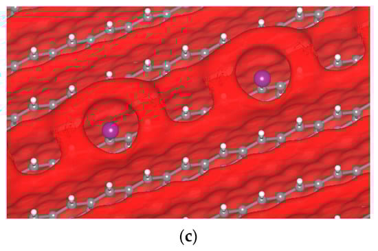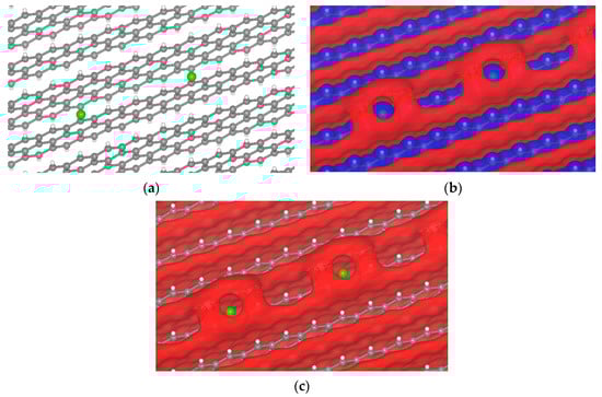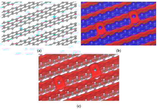 Passivated H-terminated (001) surface. (a) Crystal of passivated graphite with iodine. Isopotential surface of graphite with iodine atom, separated between negative (red) and positive (blue) regions; (b) graphite atomic conformation and isopotential ±2.35 V; and (c) graphite atomic conformation and isopotential −2.35 V.
