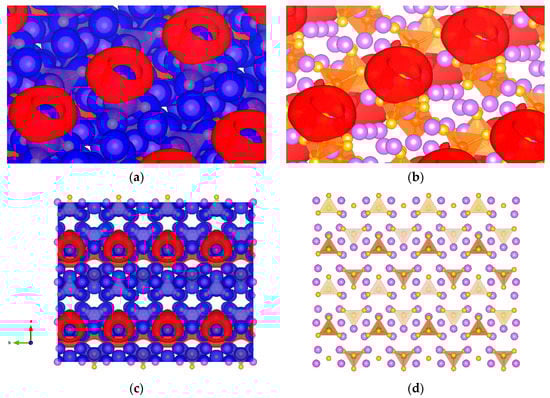 Isopotential surfaces of solid electrolyte Li7P2S8I, separated between negative (red) and positive (blue) regions. (a) Shows the +0.5 and −3.8 V isosurfaces along the b-axis perpendicular to the crystal surface; (b) atomic conformation with the negative isopotential; (c) front view of the isopotential surfaces along b-axis; and (d) atomic conformation front view. Solid purple spheres represent lithium, green for iodine, yellow for sulfur, and orange for the PS4 tetrahedron.