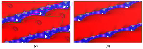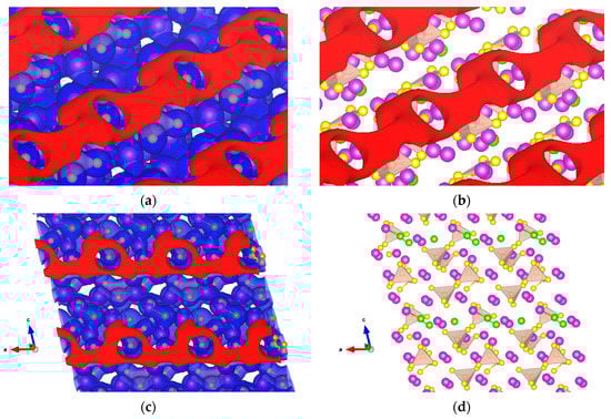 Isopotential surfaces of Li7P2S8I, separated between negative (red) and positive (blue) regions. Positive isopotential remains constant at +0.5 V, and negative isopotentials are (a) −3.8; (b) −3.6; (c) −3.5; and (d) −3.4 V.