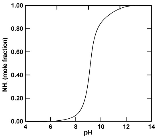 More carbon dioxide is absorbed by aqueous ammonia at a higher pH value; in addition, more ammonia is created at a higher pH value. Therefore, the best pH value will facilitate the absorption process, as shown in Figure 2. Equations (1)–(3) are the formulas for ammonia dissociation in water. As ammonia will be separated due to the effect of the pH value and a higher pH value can help the formation of NH3(aq), NH3 can be separated out of the solution [16]. As shown in Figure 2, it is known that, when pH = 9.5 the mole fraction of NH3 is about 0.8, which could be a very good operating condition in terms of ammonium bicarbonate generation.