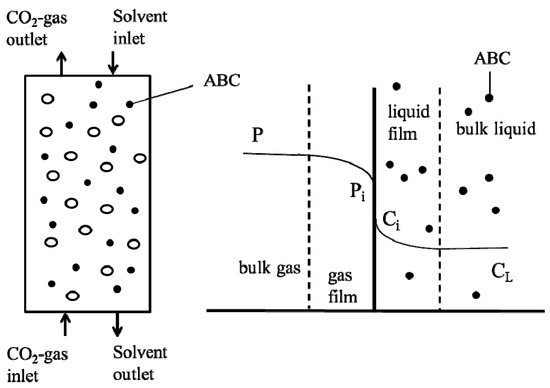 In a bubble-column scrubber, a gas mixture containing carbon dioxide (A) and nitrogen (B) flows into a bubble column from the bottom and continues through the distributor, thus, coming into continuous contact with the aqueous ammonia solution flowing into the column from the top. The two streams come into contact within the column’s countercurrent simultaneously. The diffusing of CO2 gas inside a gas bubble in the solution can be described by a Two-film model, as shown in Figure 3. The CO2 gas at pressure P diffuses from the left side to the gas-liquid interface and enters into the liquid side, where it is absorbed by the aqueous ammonia solution. At the interface, the relationship between the partial pressure of the CO2 and the dissolution of the CO2 in the liquid can be expressed by Harry’s Law (PA = HCA). According to this model, the absorption rate and overall mass transfer coefficient can be determined using measurable quantities [21].