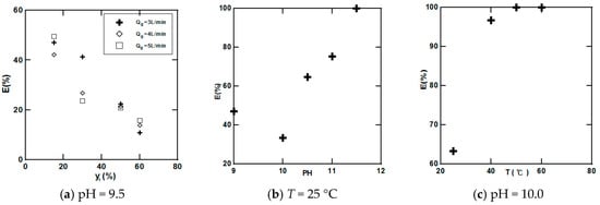 Effects of process parameters on the removal efficiency of CO2: (a) effect of y1 on E at pH = 9.5; (b) effect of pH on E at T = 25 °C; (c) effect of T on E at pH = 10.0.
