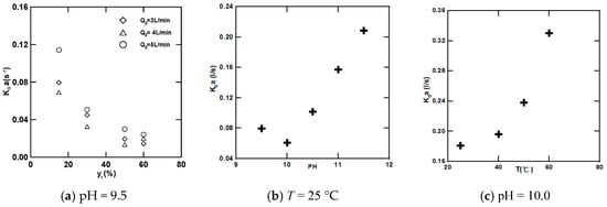 The effects of y1, Qg, pH and T on the overall mass transfer are also investigated. Figure 7a shows that the effect of y1 on KGa at various Qg is obvious. It also shows that KGa decreases with an increase in y1 indicating a higher mass resistance at higher gas concentrations. In addition, KGa increases with the increase in Qg, which indicates that increasing the gas-liquid contact surface area and turbulence mixing results in a more effective contact. The effects of pH levels and gas inlet temperatures on KGa are expressed in Figure 7b,c. The effects of the pH level and temperature on KGa are obvious, indicating the significance of pH and temperature. However, the KGa, as obtained here, is in the range of 0.0136–0.3302 1/s, which is comparable with other solvents, such as MEA solvent which is in the range of 0.0342–0.881 1/s [28] and NaOH/BaCl2/H2O, which is in the ranges of 0.0651–0.3396 1/s [5] and 0.015–0.14 1/s for a stirred-tank scrubber using an aqueous ammonia solution as the scrubbing solution [4]. On the other hand, from data reported in literatures [8,13,26,27], the KGa can be recalculated for comparison. The recalculated values of wetted-wall column tests are 0.03469–0.2658 1/s [13] and 0.02551–0.4336 1/s [26], respectively; while the recalculated values for packed column are in the range of 0.486–2.43 1/s [8] when a specific area of packings, 500 m2/m3, is available. Moreover, the KGa is 2.21 1/s when using aqueous hydrazine solvent [27].