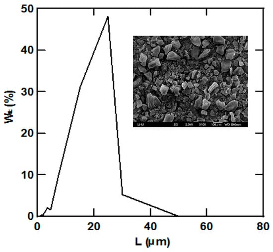While the formation of ABC is found here, it is not found under all conditions, such as Nos. 3, 4, 6, 7, 8, 10, 11 and 12 at a pH level of 9.5. Figure 8 for No. 12 shows the crystal size distribution measured using a CIS-1 particle size analyzer. The major distribution is in the size range of 30–100 μm. On the other hand, when the crystals are examined by SEM, as also shown in Figure 8, small irregular crystals are observed indicating the fracture property of ABC crystals.