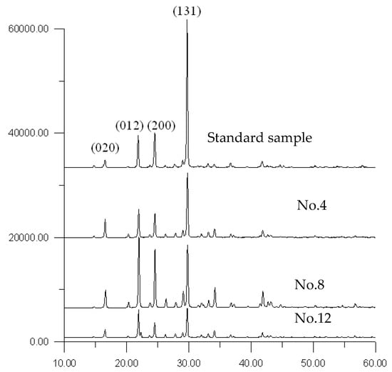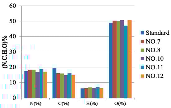Figure 9 shows the XRD spectra for the three runs, as compared with the standard ABC crystals bought at the market. The major peaks for a standard sample are 29.7 (131), 16.6 (020), 21.9 (012) and 24.5 (200), which are the major peaks for ABC crystals, as reported by Meng [29]. However, the peaks of the three samples exhibit the same peaks as the standard sample, thus, confirming the formation of ABC crystals in this work. Alternatively, EA analyses according to N, H, O and C for ABC crystals are shown in Figure 10. Analysis finds that all elements are close to that of a standard sample, indicating that the precipitates obtained here are confirmed to be ABC crystals.