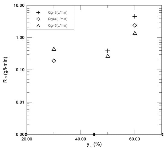 Finally, the precipitation rate for ABC crystals could be evaluated using Equations (15) and (16) when the slurry density (MT) and mean residence time (T) are obtained. Figure 11 shows that Rp is increased with an increase in y1 at various rates of Qg. The results show that, the gas concentration has significant effect on the Rp value as compared with Qg. Alternatively, analysis of γ finds that the precipitates of ABC can be obtained when γ is higher than 1.5; however, no precipitates are observed when γ is lower than 1.5, regardless of the pH level.
