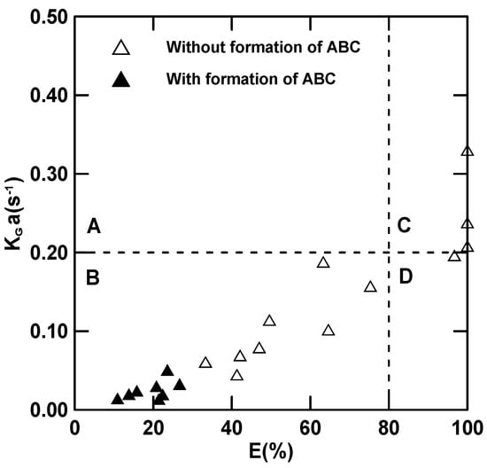 The KGa obtained here can be used to calculate the scrubber size [16]. Generally speaking, a larger KGa means that a smaller scrubber size is required, while a higher E shows an effective reduction in CO2 emissions. Thus, obtaining a larger KGa and E is the major focus in process design. Figure 12 shows that KGa increased with an increase in E, showing a linear relationship. In order to clarify, the target of KGa and E are set at 0.2 L/s and 80%, respectively. Therefore, the figure can be divided into four areas, i.e., A, B, C and D, in which C shows a higher KGa and E. On the contrary, B shows a lower KGa and E, especially in the case of the formation of ABC. Excluding the formation of ABC data, KGa/E can only be correlated with the pH of the solution and γ, as parameters T, the concentration and flow-rate are included in γ. The regression results are shown, as follows: