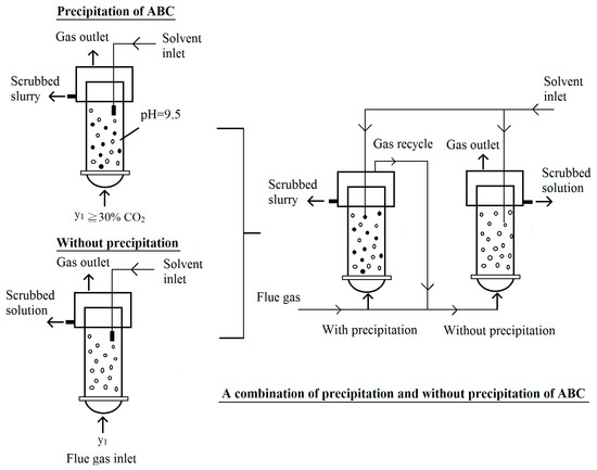 The absorbents used for chemical absorption include the alkaline solutions of all levels, such as amine, ammonia, sodium hydroxide and hot potassium carbonate [3,4,5,6]. Among numerous absorption technologies and absorbents, the monoethanolamine (MEA) process is the most popular and already operates in more than a thousand units which is comparable with 700 plants for potassium carbonate solution [6]. However, the MEA process still has some disadvantages including low absorption efficiency, low CO2 loading, high regeneration energy requirements and the container corrosion issue [3,7]. In the case of using MEA as the absorbent, the absorbed carbon dioxide is stored in the liquid phase in a liquid state, which might be released again due to the influence of the pH value and the huge volume. Therefore, in some studies, MEA is changed to aqueous ammonia as the absorbent, which is used to absorb the carbon dioxide as reported in the literature [1,3,8].