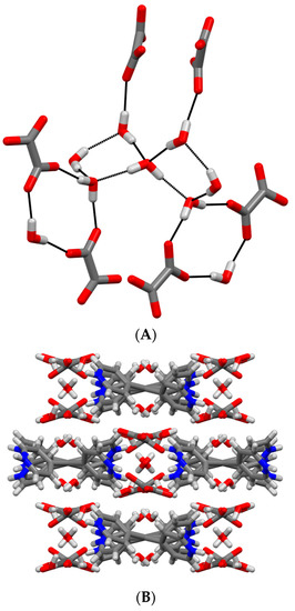 (A) Tetrameric water clusters linking oxalate ions in 7 (oxalic acid)2 7H2O; (B,C) Two views of the extended packing in 7 (oxalic acid)2 7H2O: (B) down c; (C) down b.