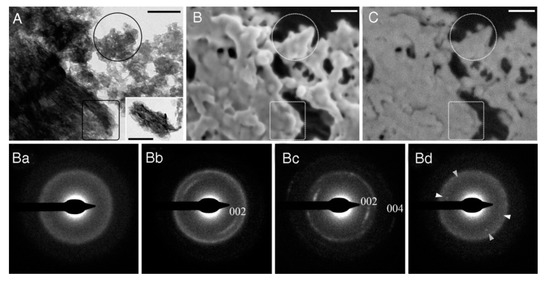 TEM and selected area electron diffraction patterns (SAED) correlated with SEM and energy selective backscattered (ESB) imaging of mineral freshly extracted from the distal end of the fin. (A and B.a–B.d) TEM micrograph of mineral particle aggregates and the corresponding SAED patterns: encircled particle produces amorphous scatter of diffuse rings (SAED, B.a). Area marked with a rectangle produces poorly crystalline diffraction (SAED, B.b), and particle in Inset produces a clear crystalline diffraction pattern (SAED, B.c), showing well defined reflections of the (002) and second order (004) apatite planes. (SAED B.d), corresponds to the encircled area examined after storage for 1 week at room temperature: As the particles begin to crystallize, diffraction spots with spacing of the (002) plane appear (arrowheads), implying conversion into a crystalline apatite phase. (B) High-resolution cryo-SEM micrograph of the same particle, uncoated, taken after examination in the TEM. (C) Corresponding ESB image, showing no distinguishable difference between the signal intensity of the amorphous (encircled area) and crystalline (rectangular area) mineral parts. (Scale bars 100 nm.) Reproduced with permission from Reference [64] Copyright (2008) National Academy of Sciences, U.S.A.