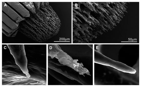 Scanning electron micrographs of regenerating sea urchin spines. (A) Five-day-old regenerated spine growing on the original broken spine. (B) Higher magnification view of the tip of the new growth, showing the typical stereom structure and the protruding newly formed microspines. (C) One microspine formed after 4 days of regeneration, observed fresh. (D) Four-day-old microspine, etched in water while fresh. (E) Four-day-old microspine, etched in water 1 month after regeneration. The newly formed tip showing the typical stereo structure of spines. Further characterization indicated that the minerals removed from fresh regenerated spines were amorphous calcium carbonate. Reproduced with permission from the American Association for the Advancement of Science in Reference [36].