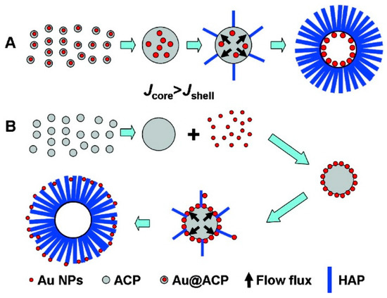 Schematic illustration of the evolution of amorphous calcium phosphate (ACP) probed by gold nano-particles (AuNPs) (A) for self-aggregation and Kirkendall process or (B) the surface of ACP sphere solution-mediated interface reaction. Reproduced with permission from the American Chemical Society in Reference [82].
