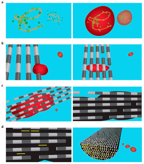 (a), Calcium phosphate clusters(green) form complexes with the polymer (orange line), forming stable mineral droplets. (b), Mineral droplets bind to a distinct region on the collagen fibres and enter the fibril. (c), Once inside the collagen, the mineral in a liquid state diffuses through the interior of the fibril and solidifies into a disordered(amorphous) phase (black). (d), Finally, directed by the collagen, the amorphous mineral transforms into oriented apatite crystals(yellow).Reproduced with permission from Springer Nature in Reference [139].