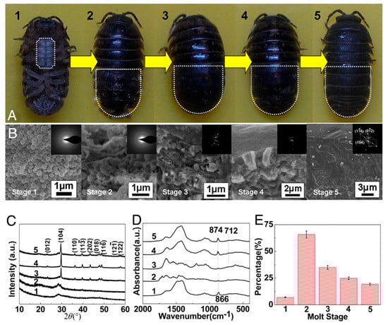 Morphology, phase, and composition of cuticles at different molt stages. The phase transformation process (amorphous calcium carbonate (ACC)-calcite) can be regulated by magnesium and Asp. (A) Photographs of Armadillidium vulgare in the different molt states (1–5). (B) SEM images and SAED patterns of the cross-sections of exocuticle layer shown in (A). (C,D) XRD patterns and Fourier transform infrared (FT-IR) spectra, respectively. (E) Organic contents of the cuticles during the molt process. Reproduced with permission from Reference [155] Copyright (2008) National Academy of Sciences, U.S.A.